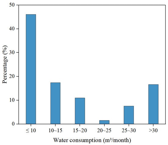 The utilities used by rural residents are generally water, gas, and electricity. As shown in Figure 12, the proportion of residents’ monthly water consumption varies greatly, with up to 45% of residents using less than 10 cubic meters of water per month, while the number of residents using 10–15 cubic meters of water per month and those using more than 30 cubic meters of water per month are similar, accounting for about 18% of the total, and the proportion of the number of people who use 15–20 cubic meters of water per month and those who use 25–30 cubic meters of water per month are on a decreasing trend, accounting respectively for 10% and 8%. The smallest proportion is the residents who use 20–25 cubic meters of water per month, accounting for only about 3% of the total.
