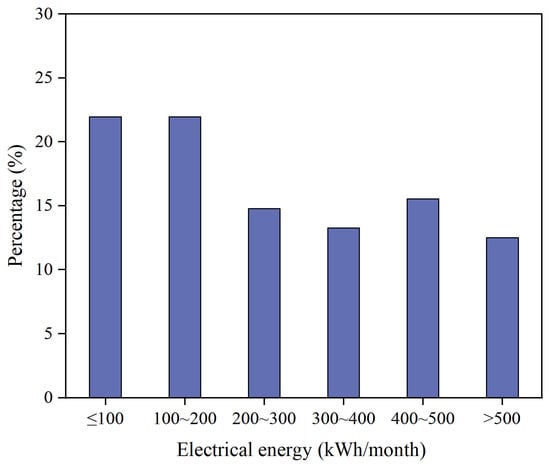 Residents’ monthly electricity consumption varies according to individual household situations, seasons, family members, and living habits. Here are some general references: For a small household, the monthly electricity consumption is usually between 100–300 kWh. For a medium-sized household, the monthly electricity consumption may range from 300–800 kWh. For large households or households with energy-intensive equipment (e.g., air conditioners, swimming pool heaters, etc.), monthly electricity consumption may exceed 800 kWh. As can be seen from Figure 14, about 60% of the residents use less than 300 kWh of electricity per month, and this segment is dominated by small households. About 40% of the residents use more than 300 kWh of electricity per month, and this segment consists mainly of medium and large households.
