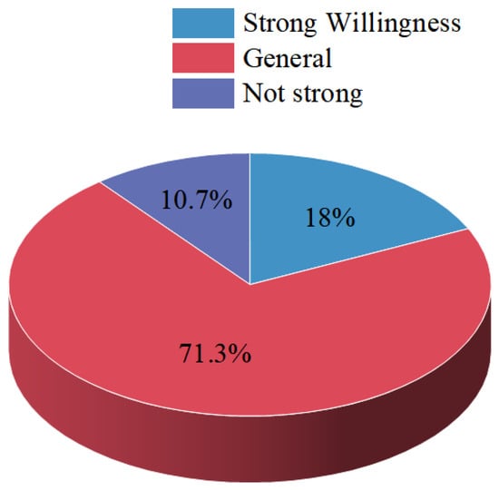 Solar energy is generally utilized by households for solar water heaters, and although the penetration rate of solar water heaters is relatively low, this clean and efficient energy source should never be ignored. Land in rural areas is cheaper than in urban areas and is vast, without too many installation limitations. The use of solar energy can improve rural sanitation and reduce the consumption of conventional energy. Figure 15 shows that most people’s willingness to adopt solar PV is not strong (71.3%) because of insufficient knowledge of solar energy as an energy source or because the use of solar energy does not save more money. Wang et al. [] found that the potential of rooftop power generation in China is 3.27 × 109 MWh per year, which means that the annual CO2 emissions will be reduced by 2.41 × 109 tons. It can be seen that rooftop solar PV utilizes the building roof resources to design distributed PV power plants, which not only can effectively help to reduce the emission of greenhouse gases but also offer a good way to accelerate the transition to green energy in order to achieve the goal of sustainable development.