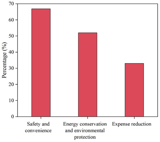 In the process of urbanization, high levels of economic development in rural areas have enabled China to complete urbanization more quickly due to relatively well-developed infrastructure and public services and higher levels of industrial development. Rural areas with higher levels of economic development have a higher proportion of clean energy consumption than rural areas that rely heavily on low-quality energy sources, such as biomass and bulk coal, and that are lagging behind in their level of economic development []. Despite this, as the world’s largest developing country, 44% and 24% of rural households in China still use firewood and coal as their main household energy source, respectively []. In this study, the share of natural gas use in rural Guangdong was found to be close to 50%, but the use of solar energy, LPG, and biogas is less than 20%, along with about 20% of firewood use. In addition, rural residents are economically rational, and the cost of purchasing and using clean energy equipment increases for individuals with low incomes. This perception affects their willingness to use clean energy []. Although Guangdong province has a higher level of economic development than most other provinces in China, there is still great potential for the promotion of renewable energy. In addition, consumer selectivity, attribution of responsibility, corresponding awareness, and environmental consequences determine the intended clean energy technology adopted by the rural population []. The research found that rural residents in Guangdong province do not have a strong desire to use solar photovoltaic technology, with less than 30% of residents having the desire to use it. Although more than 70% of residents believe that solar energy technology can save energy and convenience and more than 50% of residents believe that the use of solar energy can protect the environment, considering some of the problems that may arise in the process, less than 20% use it.