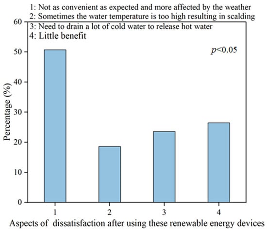 As shown in Figure 17, most of the residents who use renewable energy and are dissatisfied with it believe that it is not as convenient as expected and the equipment is affected by the weather, which is a major disadvantage of the promotion of the use of renewable energy. The key to solving this problem is through the storage of energy, to reduce the impact of rain and other inclement weather on the residents’ use of energy. Therefore, the construction of rural energy needs to be based on rural reality. Some residents also believe that the use of renewable energy sometimes produces too high water temperatures, leading to scalding and the economic benefits are not very high. At the same time, because there is no installation of circulating pipes, there is a need to drain a lot of water in order to release hot water. All these situations cause a lot of inconvenience to the residents in the process of use.