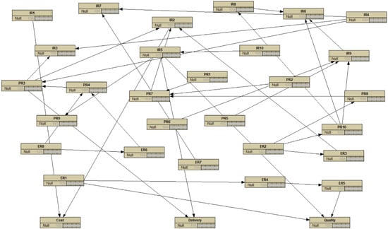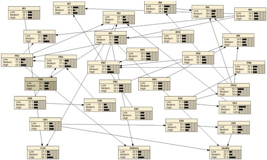 After the BBN model was constructed, a sensitivity analysis was conducted. The sensitivity analysis measures the degree to which any node can influence the beliefs of another node []. Table 5, Table 6 and Table 7 show that the risk factors ER5, ER1, ER4, PR9, IR5, and IR10 were identified as sensitive quality-related factors, each having a relatively high degree of impact on the occurrence of low quality. Risk factors IR2, IR1, and PR7 were identified as sensitive cost-related factors, each having a relatively high degree of impact on the occurrence of extra costs. Risk factors PR9, IR5, PR3, IR10, IR3, IR4, and IR7 were identified as sensitive delivery-related factors, each having a relatively high degree of impact on the occurrence of time delays. Quality and delivery were identified as critical factors that significantly affect the results of the final OSM production. Therefore, more attention should be given to quality and delivery in order to reduce risks in OSC projects.