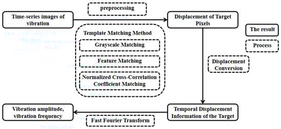 The implementation of the bridge structure vibration monitoring method based on computer vision is shown in Figure 1. Structural vibration time series imagesare captured using a camera, and the captured images are preprocessed to improve image quality. Subsequently, the template matching method is used to locate image targets based on the correlation and consistency of analyzed textures, gray levels, and features. After completing the tracking of the target points, the pixel displacements are converted into physical displacements to obtain the time–history information of the target displacements. Finally, by converting the time–history information into the frequency domain (using Fast Fourier Transform, FFT, in this paper), the vibration amplitude and vibration frequency of the monitored target can be obtained.