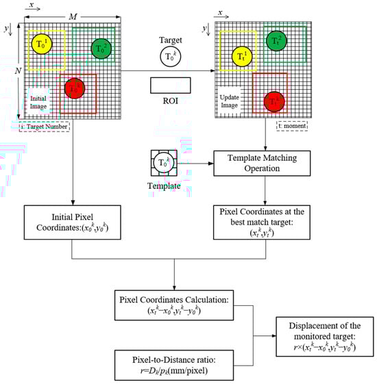 The basic implementation steps of the template matching methodare shown in Figure 2. Firstly, an image containing the target is captured by a camera, and an area with the monitored target within the image is designated as the template, from which the center pixel coordinates of the template are obtained. Subsequently, the ratio between the actual distance Dk between the target T0k and a calibrated reference point R0 and the pixel distance pk is calculated to derive a scale factor r, which serves as the calibration parameter for all subsequent images captured by the current camera. Then, the preset template from the first image is searched within a designated region of interest (ROI) in subsequent images captured by the camera, and a template matching operation is performed. During the search and matching process of the template, based on image correlation operations, each template matching yields a normalized correlation coefficient. When this normalized correlation coefficient reaches its maximum value, the preset template achieves the best match in the current image, thereby determining the center pixel coordinates of the template containing the monitored target within the image. By calculating the difference between the center pixel value of the matched image area and the center pixel value of the preset template, the pixel coordinate change of the target point can be obtained, which is represented as (xtk-x0k, ytk-y0k) in Figure 2. Finally, the scale factor r obtained from calibration is multiplied by the difference in pixel coordinate changes to obtain the actual displacements of each target point in both horizontal and vertical directions.