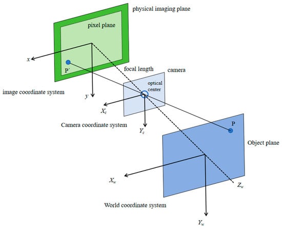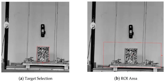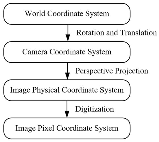 The industrial camera is positioned directly in front of the vibration table to capture images, ensuring that the monitoring target and the camera are on the same horizontal plane. The horizontal direction of the presented image corresponds to the direction of the target movement. Figure 6 illustrates the imaging principle of the camera []. Light emitted or reflected from an object passes through a pinhole into the dark chamber inside the camera. Due to the limitation of the small hole, only the light rays from a specific point on the object can pass through the pinhole and form a corresponding light spot on the photosensitive medium inside the dark chamber. As these light spots accumulate continuously, they eventually record a complete inverted real image of the object on the photosensitive medium. To obtain the true displacement of the target, it is necessary to perform mutual conversion between the displacement in the image coordinate system and that in the world coordinate system. Figure 7 demonstrates the principle of converting coordinates from the world coordinate system to the image coordinate system [,,]. Initially, the coordinates of points are transformed from the world coordinate system to the camera coordinate system through rigid body transformations, which include rotation and translation. Subsequently, through perspective projection, the coordinates are converted from the camera coordinate system to the physical image coordinate system. Finally, through translation and scaling, the coordinates are transformed into the image pixel coordinate system. For ease of calculation, the video resolution used in indoor experiments is 1920 × 1080, with a frame rate of 30 fps. Figure 8 displays the target object and the region of interest (ROI) selected for template matching. Among them, the preset template has a resolution of 144 × 144.