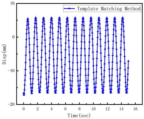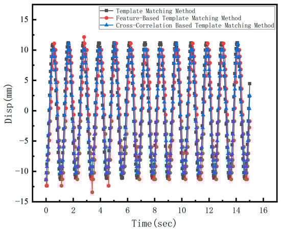 The cross-correlation-based method and the feature-based template matching method were used for comparative study, and the results are shown in Figure 14. The monitoring results of the three methods are generally quite close. However, the maximum amplitude monitored using the cross-correlation-based method is 12.143 mm, with a maximum amplitude error of 5.59%. The maximum amplitude monitored using the feature-based template matching method is 13.155 mm, with a maximum amplitude error of 14.39%. The maximum amplitude errors of both methods are greater than that of the method proposed in this paper.