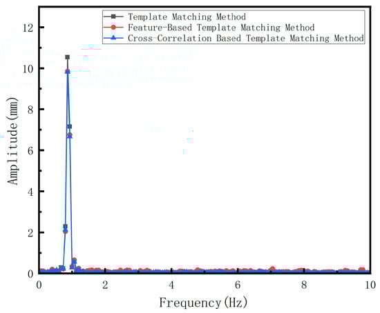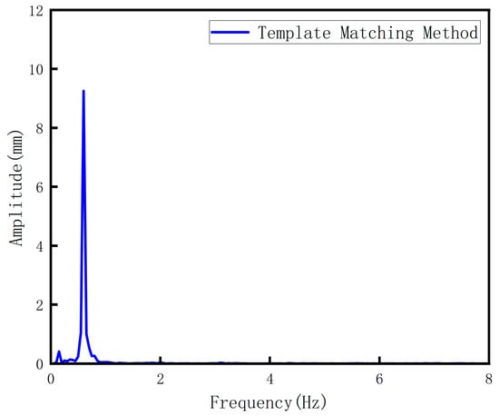 Among them, the first-order frequency calculated using the feature-based template matching method is 0.864 Hz, with a frequency error of 1.82%. The first-order frequency calculated using the cross-correlation-based method is 0.871 Hz, with a frequency error of 1.02%. The frequency errors of both methods are greater than 0.2%. This is because the cross-correlation-based method does not incorporate normalization operation. Thus, when the lighting in the original image is uneven, areas with high brightness may be mistakenly identified as the best matching locations, making the matching results susceptible to interference. The feature-based template matching method requires the detection of key points, and the presence of reflective regions in the template image selected for the experiment may disrupt the optimal matching. Additionally, these two methods are pixel-level target displacement identification methods which accuracy is limited by the resolution of the image, with the smallest unit being one pixel, making it impossible to capture changes smaller than a single pixel. The method proposed in this paper incorporates normalization, reducing the impact of uneven lighting and enhancing the accuracy and robustness of the method. Moreover, this method is a sub-pixel target displacement identification method. Sub-pixel target displacement identification methods improve measurement accuracy to a fractional level of a pixel through interpolation, fitting, or optimization algorithms, significantly enhancing the precision of the measurement results and enabling the identification and measurement of tiny displacements, deformations, or feature changes.