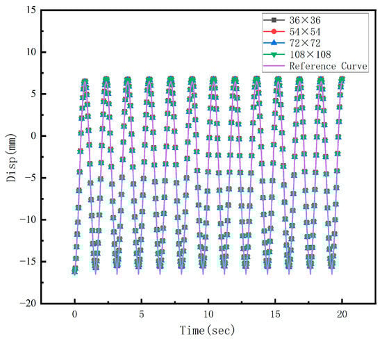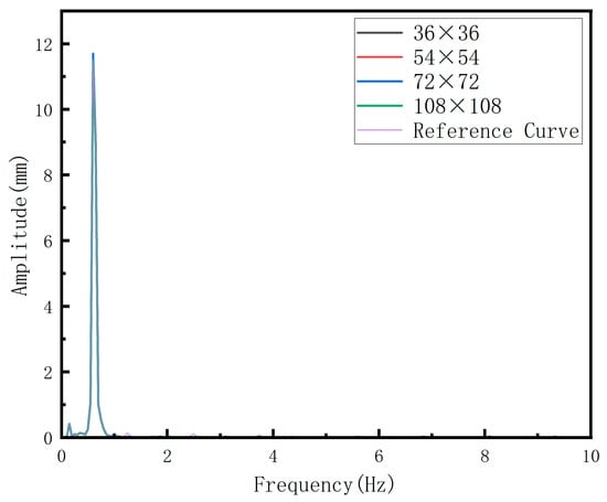 As observed in the figure, using a template with a resolution of 36 × 36 yields the amplitude of 11.525 mm, a period of 1.14 s, and an amplitude error of 0.22%. With a template resolution of 54 × 54, the amplitude is calculated to be 11.465 mm, the period is 1.12 s, and the amplitude error is 0.3%. Applying a template of 72 × 72 resolution results in an amplitude of 11.475 mm, a period of 1.13 s, and an amplitude error of 0.22%. Using a template with a resolution of 108 × 108, the amplitude is 11.495 mm, the period is 1.12 s, and the amplitude error is 0.04%. These four sets of data align closely with the input data from the shaking table. The Fourier Transforms of the four sets of time–history information are depicted in Figure 13.