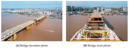 Yongning Bridge is a jointly constructed bridge spanning the Feiyun River, connecting the first phase of the Wenzhou City Railway S3 Line and the southern section of Wenrui Avenue Expressway. The bridge features a double-deck layout, with the upper deck serving as an urban expressway designed for two-way six-lane traffic at a speed of 80 km/h. The middle of the lower deck accommodates the S3 Line of the city’s railway, designed for a speed of 140 km/h, while the two sides are designated as Class I highways with a design speed of 60km/h. Upon completion and opening, the S3 Line trains will traverse the lower deck of the bridge simultaneously with vehicles traveling on both sides and the upper deck. The bridge is illustrated in Figure 16.