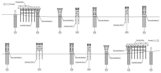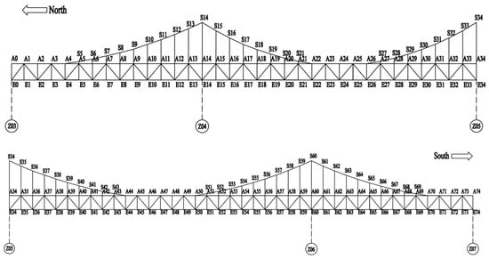 The steel truss girders of the second, third, and fourth spans of the main bridge of Yongning Bridge were constructed using the incremental launching method, which involved “synchronous pushing from both banks, assembly section by section, and incremental launching into position”, ultimately achieving closure at the A29–A30 segment joint. The incremental launching of steel truss girders employs a multi-point traction and dragging process. The launching system comprises four parts: a horizontal traction system, a jacking system, a sliding system, and a deviation correction system. After assembling the steel truss girder segments, the jacking system activated to lift the girders shims is installed above the sliding shoes, which then support the steel truss girders. The horizontal traction system then pushes the girders forward by one stroke, with real-time deviation correction provided by the deviation correction system throughout the process. During the launching operation, the temporary piers mainly undergo vertical displacement with negligible horizontal displacement. Specifically, the length of the main girder pushed from the north bank was 342.75 m, while that from the south bank was 536.25 m. The schematic diagram of the steel beam joints is shown in Figure 17. A total of 26 temporary structures were set up for the incremental launching construction of the main bridge, including three temporary piers on each bank, as illustrated in Figure 18. After the completion of temporary pier construction, with the incremental launching of the main girder, the pier loads and horizontal forces continually increase, which may lead to excessive settlement, uneven force distribution, and other safety hazards on the temporary piers, affecting the accuracy of the incremental launching closure. To ensure the safety of personnel and property, it is particularly important to conduct safety monitoring and dynamic assessment of the health status of temporary piers during the incremental launching process. For the incremental launching process of the steel truss girder of Yongning Bridge, real-time monitoring of displacement and settlement of temporary structures was conducted to evaluate the structural safety status and achieve safety risk control, thereby enabling precise control over the girder pushing process.