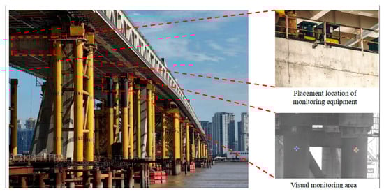 During the entire incremental launching construction process of Temporary Pier L03 of Yongning Bridge in June 2024, the method proposed in this paper was adopted for continuous displacement monitoring onsite. The visual monitoring area and the layout of the monitoring equipment are shown in Figure 19. The monitoring equipment used was an industrial camera equipped with a CMOS sensor featuring a resolution of 1920 × 1080, where the diagonal length of the sensor is 1/1.8 inches, and it offers a measurement accuracy of 1 mm within a distance of 100 m. The industrial camera was mounted on a steel bracket, which was securely fastened to the cap beam of the permanent pier using bolts. In the monitoring area, two targets were installed, each measuring 40 cm × 40 cm in size. Based on the conclusion drawn during the experimental phase that the template had a size between 36 × 36 and 108 × 108 and achieved better monitoring results, considering the resolution of the targets in the camera, the template size was set to 54 × 54. The industrial camera was connected to the network, allowing for real-time upload of the monitoring data. When excessive displacement of the temporary pier was detected, it could trigger an alarm in a timely manner, thereby assessing the structural safety status of the temporary pier and achieving safety risk management and control. Furthermore, due to the dim lighting at night and the proximity of the construction site to the city center, no construction activities took place during the night. Therefore, the industrial camera was turned off at night, and no displacement monitoring of the temporary pier was conducted.