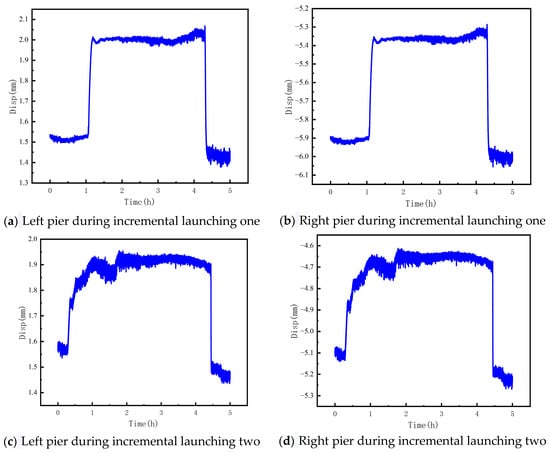 During June 2024, Yongning Bridge underwent multiple incremental launching operations. Figure 20 presents the vertical displacement–time history curves for two piles of the L03 temporary pier during two construction operations. In Figure 20a, when the jacking system was activated, the settlement of the left pile of the temporary pier decreased by 0.5 mm. During the horizontal traction process, the settlement remained almost constant. After the launching operation was completed and the beams were lowered, the settlement increased by 0.6 mm. In Figure 20b, upon activation of the jacking system, the settlement of the right pile of the temporary pier decreased by 0.5 mm. Throughout the horizontal traction, the settlement remained nearly unchanged. Upon completion of the launching and lowering of the beams, the settlement increased by 0.7 mm. In Figure 20c, when the jacking system was initiated, the settlement of the left pile of the temporary pier decreased by 0.35 mm. During horizontal traction, the settlement remained virtually constant. After the launching and beam lowering, the settlement increased by 0.45 mm. In Figure 20d, upon activation of the jacking system, the settlement of the right pile of the temporary pier decreased by 0.4 mm. During the horizontal traction, the settlement hardly changed. After the launching was finished and the beams were lowered, the settlement increased by 0.55 mm. The displacement–time history curves for these two launching operations exhibited trends consistent with actual construction conditions. When the jacking system was activated, the weight of the steel truss girder was transferred to the structure supporting the jacking system, reducing the load on the temporary pier and thus decreasing its settlement. During horizontal traction, the settlement remained almost constant. Upon completion of the launching and subsequent beam lowering, the increased load on the temporary pier led to an increase in settlement. Therefore, the method proposed in this paper can be effectively applied to practical engineering scenarios.