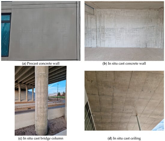 Examples of precast or in situ formed concrete structures showing reinforcement shadows visibility (photos taken by author).