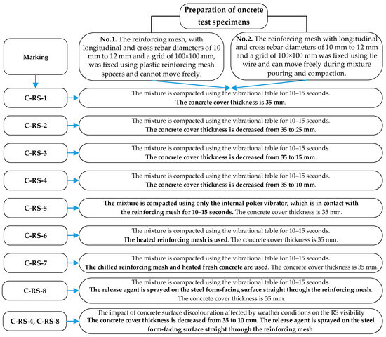 Despite using flowable concrete, a vibrational table was used not only to compact fresh concrete and achieve the required appearance of test specimens for visual concrete, but also to simulate factory conditions. As mentioned before, the subject of this investigation is precast reinforced concrete wall elements produced in the factory in the horizontal position, in contact with a steel form-facing surface. The test specimens were also cast horizontally in contact with steel from-facing surfaces coated with a water-soluble release agent. The 35 mm concrete cover of test specimens was chosen to achieve the required durability for precast concrete elements, such as walls, simulated in this research. In addition, during research, the cover thickness was decreased from 35 mm to 15 mm to determine its impact on the RS effect. To maintain the specified cover in precast concrete elements (exposed concrete walls), the factory uses different methods to fix the reinforcing mesh in a mould, such as plastic reinforcing mesh spacers and tie wire. This means that the mesh could freely move during the mixture compaction and impact the RS effect in the latter.