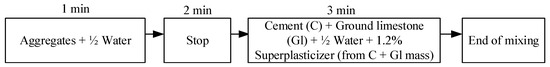 The fresh concrete was prepared in the laboratory according to standard LST EN 206:2013+A2:2021 [34]. The concrete mixtures were mixed using dry materials and a Zyklos rotating pan mixer ZZ 50 HE from Pemat (Freisbach, Germany). The mixing was performed according to the following stages (Figure 3):