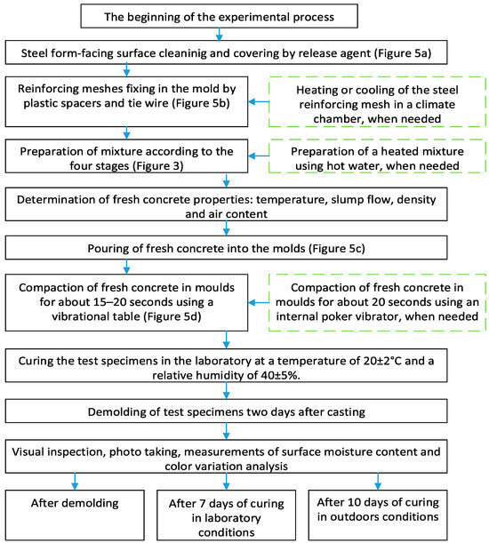 The objective of the research presented in this article is to analyse the possible causes of reinforcement shadows on the formed concrete surface of test specimens produced under laboratory conditions when assessment is based on visual inspection, surface moisture content measurements, and colour variation analysis. The colour variation analysis was based on the recognition of colour, where the evaluator can visualise colour through its attributes such as blackness, hue, and brightness. A camera was used to capture the appearance of the concrete surface, the surface moisture content was determined using a portable device, and a portable colour reader was used to analyse the concrete surface’s colour variation using blackness, hue, and brightness. It was executed with the aim of maintaining laboratory conditions similar to realistic factory conditions that are important for industrial applications defined with a precast concrete production company. A vibrational table, with a length of 2.0 m and a width of 1.2 m, was made for this research, and the concrete test specimens were produced and cured in the controlled environment at a temperature of 20 ± 2 °C and a relative humidity of 40 ± 5%. During the interview with the precast concrete element production manager, the main factors that can cause a reinforcement shadow visibility on the formed concrete surface were identified based on production experience. The impact of these factors on RS under laboratory conditions was investigated according to the research flow chart shown in Figure 2. In some cases, a relationship was found between the factors selected in the interview with the production manager and factors those found in the literature analysis.
