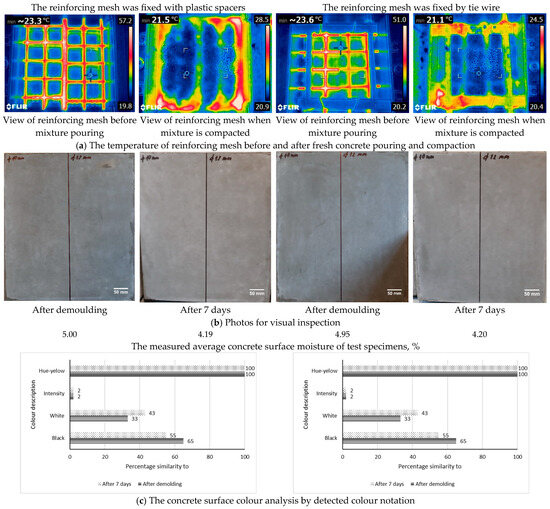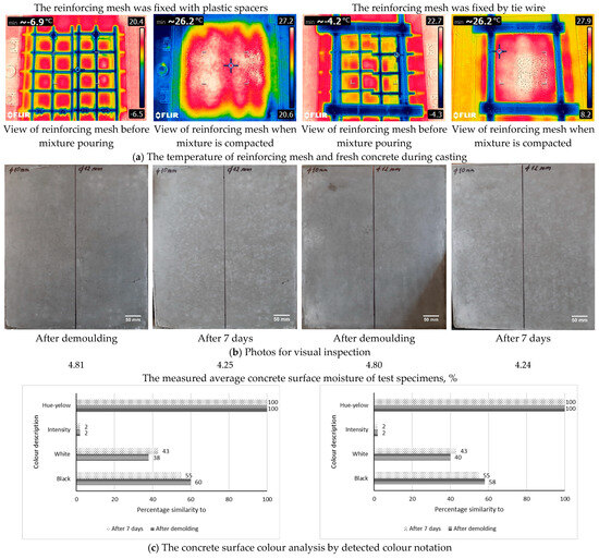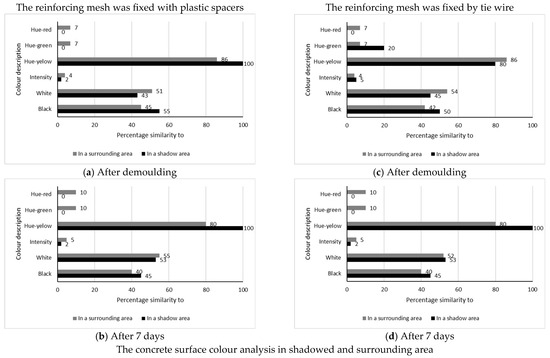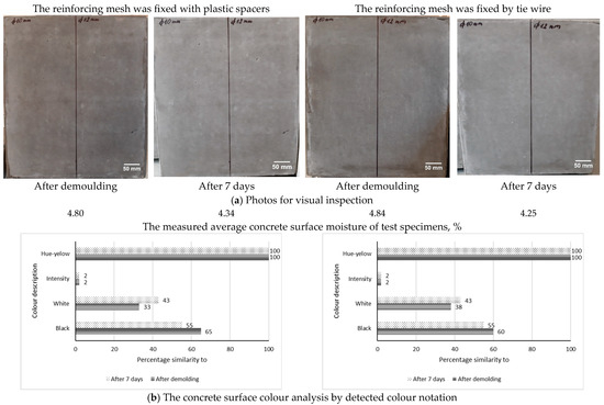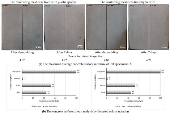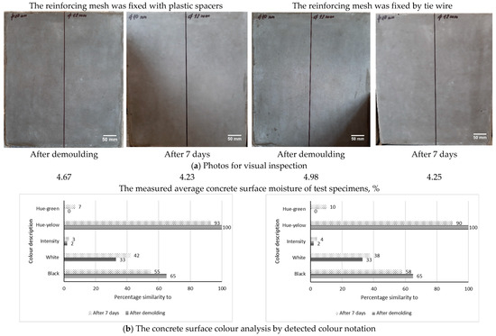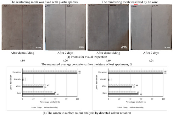 The graphs presented in Figure 13c show that regardless of whether the reinforcing mesh was fixed with plastic spacers or tied by wire on the formed concrete surface, the percentage of similarity to the black colour was 65% and to the white colour was 33%. The average surface moisture after demoulding was about 5.00% and 4.95%, respectively. After seven days of curing, the concrete colour became lighter in both cases due to the continuing cement hydration process, and the similarity percentage to the black colour decreased to 55%, while the similarity percentage to white increased to 43%.
