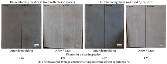 The photos in Figure 7a, Figure 8a and Figure 9a taken for the visual inspection reveal no visible signs of reinforcement shadows on the formed concrete surface after demoulding and after 7 days of storage in the laboratory when the concrete cover thickness was reduced from 35 mm to 15 mm. The measured concrete specimens’ surface moisture was higher after demoulding than after seven days of curing. The average surface moisture decreased from about 4.80% and 4.90% to 4.20% and 4.30%, respectively, due to water evaporation. After the specimens were removed from the moulds, a grey colour with a yellow hue on the concrete surface was detected. The inherent grey colour of hardened cement paste depends on iron oxide and manganese oxide content [13,14,15]. It can vary from darker to lighter shades and presents a yellow hue.