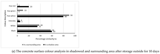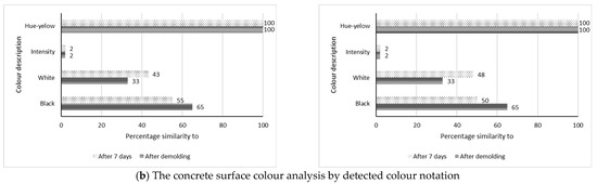 Only the concrete specimens with a cover thickness of 35 mm had the same black and white colour similarity percentage after being removed from the moulds and after curing for seven days. The percentage similarity to black was 45%, to white 53%, and hue was 100% yellow (Figure 7b). Table 5 shows that on the casting day of those specimens, the ambient temperature was 22.1 °C, and the humidity was 24.6%. It was noticed that the ambient temperature was slightly higher and ambient humidity somewhat lower than on the days when the concrete specimens with a cover thickness of 25 mm, 15 mm, and 10 mm were being cast. Concrete cures faster in hot weather, and if the air is very dry, the water in concrete can evaporate quickly, causing it to become lighter in colour [9].