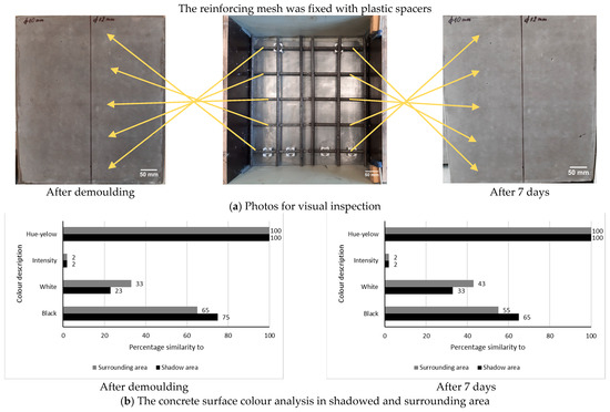 This section analyses the hypothesis that the release agent sprayed on the steel form-facing surface straight through the reinforcing mesh creates the RS visibility on the formed concrete surface. Operators must comply with on-site monolithic concrete structure construction technology requirements or the factory’s precast concrete element production technology. However, sometimes it happens that release oil is sprayed by the operator after the reinforcing mesh is placed, in which case the longitudinal and cross reinforcing bars partially block the spray of the release agent on the steel form-facing surface. The simulation of this case study is presented in Figure 15. The release agent, a water-soluble emulsion, was sprayed on the steel form-facing surface throughout the reinforcing mesh, which had a grid size of 100 × 100 mm and reinforcing bar diameters ranging from 10 mm to 12 mm (Figure 15a). The concrete cover thickness was 35 mm (C-RS-8). After that, the fresh mixture was poured into the moulds and compacted using the vibrational table for 10–15 s. Figure 15b presents pictures of concrete specimens removed from the moulds after two days and cured under laboratory conditions for seven days. It is seen that after the test specimens were removed from the moulds, the visibility of the shadowed area and surrounding area on the exposed concrete surface was brighter compared to the same specimens after seven days of curing. In addition, the reinforcing mesh tied by tie wire was able to move during mixture pouring and compaction and has a little bit brighter RS visibility, compared to the concrete specimens where the reinforcing mesh was fixed with plastic spacers and was not able to move. The shadows formed on the concrete surface show that the diameter of the reinforcement did not affect the width of the shadow zones.