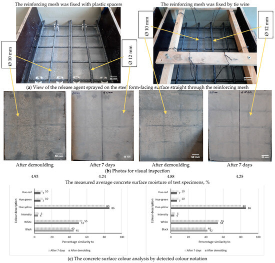 Conversely, when the reinforcing mesh was fixed by tie wire, the percentage of similarity to the black colour was 42% and to the white colour 54%, while the average surface moisture was about 4.88%. After seven days of curing, the concrete colour became lighter in both cases due to the continuing cement hydration process, and the percentage of visual blackness decreased to 40%. The average surface moisture from water evaporation during storage under the laboratory conditions decreased to 4.24% and 4.25%, respectively. Figure 15c shows that the yellow hue of the inherent grey colour decreased to 80%, and new hue colours, such as red and green, were detected when the reinforcing meshes were fixed in the mould using two methods. Thus, it affects the mottling concrete surface appearance. In addition, the intensity percentage of the colour increased from 4% to 5% after 7 days of storage in the laboratory. This means that the different amounts of release agent sprayed on the steel form-facing surface impacted the concrete colour differences: an excessive amount of release agent was sprayed throughout the reinforcing mesh, with a grid size of 100 × 100 mm. At the same time, there was no release agent below the reinforcing mesh (whose diameters were 10 mm and 12 mm) on the steel form-facing surface (Figure 15a). The research used the water-soluble emulsion to reduce the adhesion between concrete and steel form-facing surfaces. An emulsion consists of one liquid dispersed as tiny droplets within another liquid that does not mix with it [45]. Emulsions consist of approximately 70% water, allowing a reduced quantity of oil on the formwork surface [46]. After the water evaporates, the film is created on formwork surfaces. The cement skin is formed in the exterior layer, which creates contact with fresh concrete and with the formwork covered by a release agent [47]. Release agents on the formwork surfaces must be applied in a thin and continuous film, without excess, to reach air-pore-free and colour-uniform concrete surfaces [48]. According to the authors [49], the subsurface layer of cementitious composites can be categorised into three parts: a cement skin measuring 0.1 mm, a mortar skin of 5 mm, and a concrete skin of 30 mm.