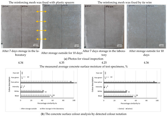 Figure 17a compares pictures of the produced concrete specimens (the cover thickness decreased from 35 to 10 mm) when stored for 7 days in the laboratory and 10 days outside. After conducting a visual inspection with the naked eye, it was seen that the grey colour of exposed concrete surfaces, after storage outside, when daytime temperature was 7.7 °C, nighttime temperature was 2.8 °C, and relative humidity was approximately 87%, became more intensive. An analysis of detected colour notation showed that the similarity percentage of the exposed concrete surface to the black colour increased from 55% to 58% (Figure 17b). The similarity percentage to the white colour decreased from 43% to 38% when plastic spacers or tie wire fixed the reinforcing mesh in the mould. In addition, the concrete surface moisture increased by a small percentage, from 4.34% (after storage in the laboratory) to 4.35% (after storage outside), when plastic spacers fixed the reinforcing mesh in the mould. In comparison, when the reinforcing mesh was fixed by tie wire, the concrete surface moisture increased from 4.25% (after storage in the laboratory) to 4.36% (after storage outside). As mentioned in Section 3.6, the cement skin is formed in the exterior layer, which creates contact with fresh concrete and the formwork covered by a release agent [47]. The pore structure in cement-based materials primarily arises from the water-filled spaces between the irregularly shaped grains of anhydrous clinker. A water content exceeding what can be entirely consumed through hydration is typically necessary to facilitate concrete formation [51]. This causes the formation of micron to sub-micron capillary pathways oriented to the cement skin in the hardened cement paste. Capillary absorption primarily drives moisture ingress in unsaturated hardened cement pastes and concretes. Water entering the pore structure can change the exposed concrete to a darker grey colour. By examining the relationship between the grayscale step wedge intensity and the resolved moisture content, the authors of [51] determined that increased moisture content in hardened cement paste increases the greyscale intensity based on a black-to-white gradient. The grey colour intensity percentage of exposed concrete surface increased from 2% to 4% (Figure 17b).