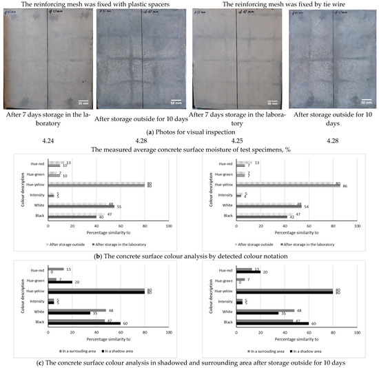 Figure 18a compares pictures of the produced concrete test specimens stored for 7 days in the laboratory and 10 days outdoors when the release agent was sprayed on the steel form-facing surface directly through the reinforcing mesh. During visual inspection with the naked eye, the grey colour of exposed concrete surfaces became more intense in the shadowed and surrounding areas after storage outside. The concrete surface colour analysis showed (Figure 18b) that on the formed concrete surface (the reinforcing mesh was fixed with plastic spacers), the percentage of similarity to the black colour increased from 40% after storage in the laboratory to 47% after storage outside, while average surface moisture increased from 4.24% to 4.28%, respectively. Conversely, when the reinforcing mesh was fixed by tie wire, the similarity percentage to the black colour increased from 42% to 47%, while the average surface moisture increased from 4.88% to 4.88%. It can be assumed that when the test specimens were stored outdoors, they absorbed more moisture, resulting in a more intensive grey colour of the exposed concrete surface. This effect was also noticed in the shadowed and surrounding areas (Figure 18c). The percentage of similarity to the black colour in the shadowed area increased from 45% after 7 days of storage in the laboratory to 60% after storage outside using two methods of reinforcing mesh fixing, as presented in Figure 16b,d and Figure 18c, respectively. In comparison, the percentage of black colour in the surrounding area increased from 40% after 7 days of storage in the laboratory to 47% after storage outside using two methods of reinforcing mesh fixing. Thus, after being stored outside, the visibility of the reinforcement shadows became brighter and with higher contrast compared to the specimens stored under laboratory conditions. This indicates that weather conditions during production, storage, or use can enhance the visibility of reinforcement shadows on the exposed concrete surface when the RS effect was formed by a release agent sprayed on the steel form-facing surface straight through the reinforcing mesh.