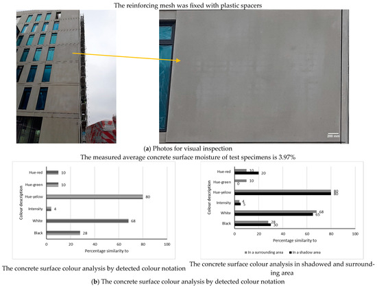The precast reinforced concrete wall element was investigated in November with a daytime temperature of 6.2 °C and a relative humidity of around 88%. The precast concrete element was installed on the construction site for approximately two months before the tests. First of all, the concrete cover thickness of the precast concrete product was determined. The Hilti PS 50 portable wall scanner was used to measure the thickness of the concrete cover or the distance from the concrete surface to the steel rebar, by keeping the device on the dark lines on the product surface. The average thickness of the concrete cover was determined to be 40 mm. The colour variations were also determined using the NCS Colour Scan 2.0 portable colour reader, while the Laserliner MoistureMaster device was used to measure moisture content on the concrete surface. The graphs in Figure 19b present the colour variation analysis of the precast concrete element surface, shadow, and surrounding areas. It can be seen (Figure 19b on the left side) that the percentage of similarity to the black colour was 28% and to the white colour 68% when the average detected surface moisture was about 3.97%. In addition, the detected colour hue combined yellow, green, and red colours. The percentage similarity to the black colour in the shadowed area was 30% compared to 28% in the surrounding area (Figure 19b on the right side). An investigation of the real-scale precast concrete element showed that the dark line of reinforcement shadow can be characterised by the percentage similarity to the black and white colours in the shadowed area compared to the percentage similarity to the black and white colours in the surrounding area.