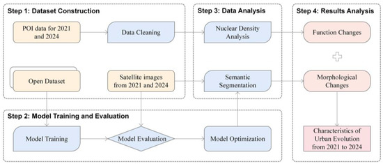 On the other hand, there is data fragmentation: a lack of a collaborative analysis framework for multi-source spatiotemporal data. Although POI (point of interest) data and satellite imagery have been used separately for urban function quantification and morphological analysis, their collaborative application is still in its infancy. In terms of functionality, while POI kernel density analysis [12,13,14] can depict the spatial clustering characteristics of commercial facilities, it is difficult to reveal the feedback effects of functional mixing on spatial morphology (such as gentrification triggered by excessive commercial expansion in historical districts). In terms of morphology, deep learning-driven interpretation of satellite and aerial imagery [15,16,17] can precisely identify changes in building textures but has not established dynamic association models with the evolution of POI functions. More critically, existing studies often adopt “static data slices” (such as matching POI and imagery from a single year) [18,19], lacking the capture of the “temporal response chain” in urban renewal processes. For example, although multi-agent models [20,21,22] can simulate the impact of traffic interventions on resident behavior, they have not integrated POI function evolution data to verify the spatiotemporal effects of business adjustments. Meanwhile, streaming POI-LSTM networks [23,24,25] achieve dynamic predictions for commercial site selection but do not couple spatial constraints from satellite imagery analysis. This data fragmentation resulted in a “black box” phenomenon [26] in the study of the linkage mechanisms between morphological reconstruction and functional regeneration.