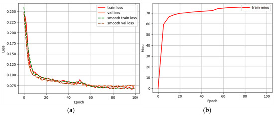 Model optimization results: (a) The loss curve; (b) The mIoU curve.