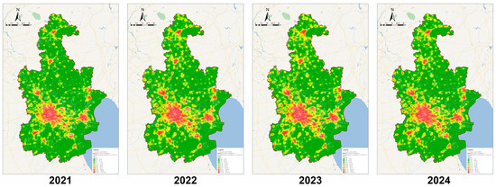 The 2021–2024 Tianjin POI comprehensive kernel density analysis map: The highest density of the main core has increased by 99.7%, and the characteristics of “one core dominance, secondary core support, and multi-point coordination” have become more evident.