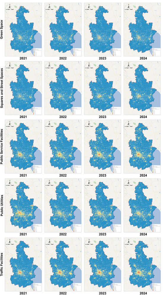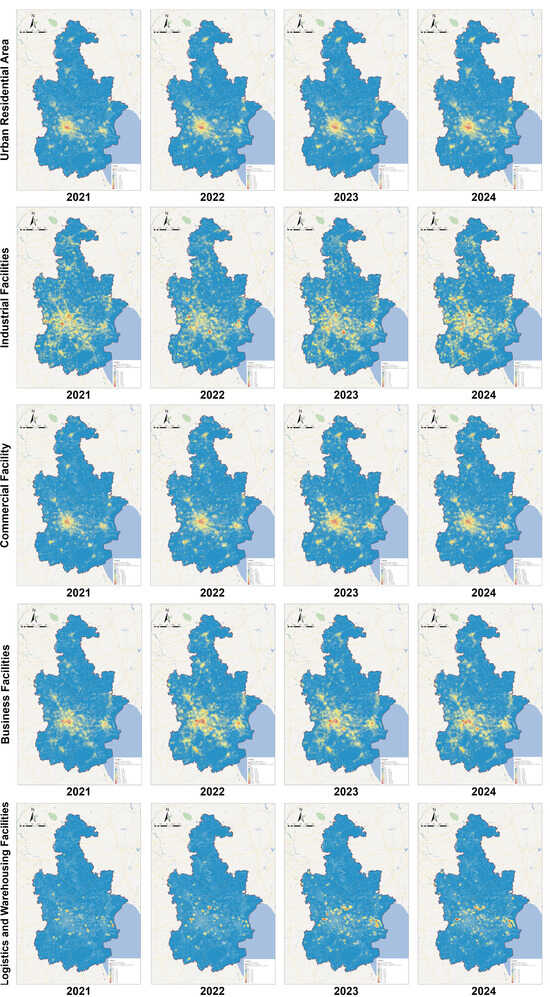 The 2021–2024 Tianjin kernel density analysis map of POIs with different functional types: Shows a clear trend of public space fission, improvement of public services, and industrial space restructuring.