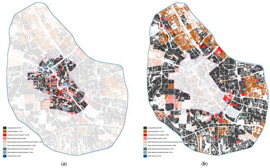 Spatial texture and functional zoning of Tianjin central urban area: (a) Historical district; (b) Outside the historical district.