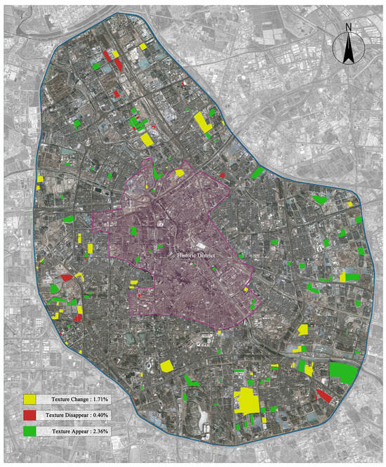 In terms of texture type, a “layered radiation” structure is presented, with residential clusters on the inside and industrial parks on the outside. In terms of functional composition, residential areas (68.8%) and industrial areas (11.4%) dominate, while public service facilities account for 10.9%, reflecting the characteristics of industry–city integration. Additionally, outside the historical district, the texture shows a clear trend towards modernization, with high-rise residential areas and emerging industrial parks gradually rising, bringing new vitality and economic growth points to the city. In the spatial layout, the area outside the historical district exhibits low-density, decentralized characteristics, with relatively flexible land use, which is conducive to urban expansion and renewal. It is noteworthy that the transportation network outside the historical district is also continuously improving, with the construction of highways, subways, and other modern transportation facilities further enhancing the area’s convenience and attractiveness. Meanwhile, with the advancement of urbanization, a number of commercial streets and cultural venues with local characteristics have emerged outside the historical district, providing residents with diverse options for consumption and entertainment. These emerging commercial and cultural venues not only enrich the city’s cultural connotations but also promote interaction and integration between the historical district and external areas.