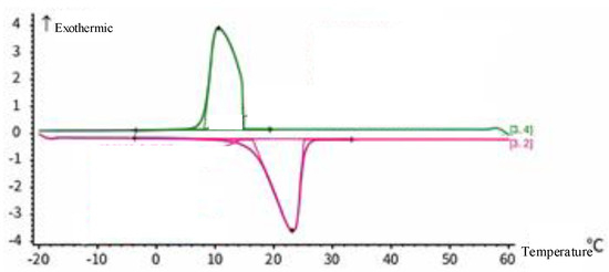 The test material, paraffin wax, is a type of organic solid–liquid phase change material with excellent performance. It has advantages such as non-toxicity, low subcooling, non-corrosiveness, and low cost. Moreover, paraffin waxes with different carbon chain lengths exhibit different phase change temperatures, enabling their use in various environments. For this field test, industrial paraffin wax with a phase change temperature of 18 °C was employed. The specific parameters are presented in Table 1, and the DSC curve is shown in Figure 4.