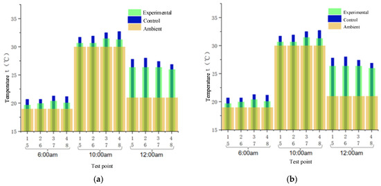 Temperature statistics of each test point without phase transition. Note: Each of the four data sets represents the results of four measurement points in the experimental and control rooms during a certain period of time. (a) Test point temperatures in the mornings of 21–25 August. (b) Temperature at the test site in the afternoon from 21 to 25 August. The three sets of data represent the inter-experimental temperature, inter-control temperature, and ambient temperature, respectively.