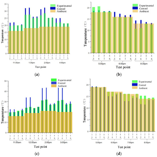 In addition, with the natural convection and rise of hot air, both the experimental and control rooms showed a tendency for the temperature of the upper side measurement points to be higher than that of the lower side. In particular, the temperature of measurement point 3 (7), which was at the highest position in the room, reached the highest value. At the time of testing, the ambient temperatures in both the experimental and control rooms were higher than 18 °C, which resulted in a relatively small temperature difference between the two houses.