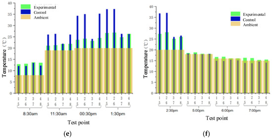 Table 13 the time of data collection is 13:00, when the ambient temperature is −5 °C. The phase change material has completed its transformation from a white solid to a transparent liquid. The phase change material had completed its transformation from a white solid to a transparent liquid and continued to undergo a phase change to release heat at an ambient temperature below its phase change temperature. The temperature between experiments was significantly higher than that between controls. Due to the high light intensity at this time, the temperature difference between test points 1 and 2 (near the energy-saving exterior windows) and test points 5 and 6 (corresponding positions in the control room) remained at about 3 °C. Meanwhile, the overall temperature difference between the other test points in the room and the experimental room reached about 7 °C because they were not exposed to direct sunlight.