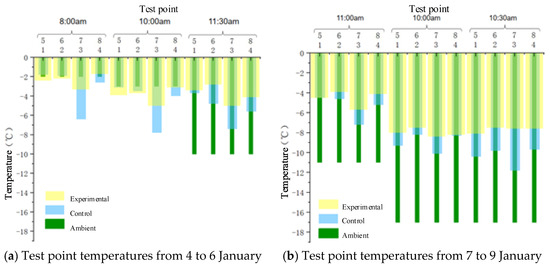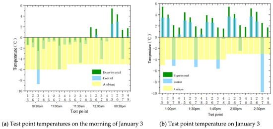 Table 11 the ambient temperature reached −17 °C when the data collection time was 10:30. Under these conditions, due to the relatively low thermal conductivity of phase change paraffin, it effectively slowed down the transfer of heat from the room to the outside. As a result, the overall temperature of the experimental room was about 2 °C higher than that of the control room. In the morning, the sunlight came into the room from the east side, which made the temperature of test point 8 on the east side of the control room higher than that of test point 5 and test point 6 on the west side. Although test point 7 was located in the interior of the room, its temperature was the lowest among all the test points, and the temperature difference with that of test point 3 at the same location was around 4 °C. The temperature of test point 8 was higher than that of test point 5 and test point 6 on the west side of the control room.