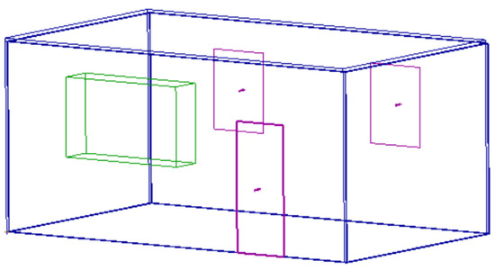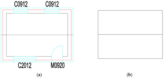 (2) Material properties: Material properties of exterior walls, doors, and windows. Select the thermal parameters of common doors and windows available in the material library. Comparison of numerical and experimental data should be more comprehensive, and it is best to combine statistical analysis to quantify bias. The corresponding material thickness and type can be corrected in the material library. Finally, the set material properties are assigned to the corresponding section, and the property setting is completed. The general situation of the experimental building is that the length of the building is 6.15 m, the width of the building is 3.65 m, the total height of the building is 2.85 m, and the number of building floors is 1 story. Detailed parameters for building design are shown in Table 3 below.
