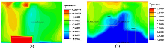 When the ambient temperature is lower than the phase change temperature, the paraffin wax in the phase change thermal storage energy-saving window body will undergo a phase change. Table 9 and Table 10 record in detail the temperature data between the experiment and the control when the paraffin phase change occurs. The corresponding temperature field distributions are shown in Figure 16 and Figure 17.