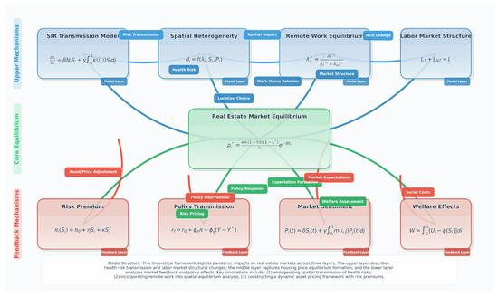 This paper constructs a theoretical framework integrating health risk transmission, remote work constraints, and spatial equilibrium to analyze the impact mechanisms of major public health events on the real estate market. This study finds that pandemics affect market equilibrium through multiple channels, including changes in residents’ utility functions, the reshaping of labor market structures, and adjustments in location choices. The model combines the SIR model from epidemiology with spatial economics to depict the endogenous decision mechanism of health risks. By constructing a two-sector general equilibrium model that includes remote work sectors, this study reveals the impact of technological change on the spatial structure of the real estate market. Based on the mobility preference theory, an asset pricing framework incorporating health risk premiums is established. Comparative static analysis shows that the health risk transmission coefficient influences housing prices through two channels: directly lowering willingness to pay and indirectly affecting the distribution of population density. Dynamic analysis indicates that, under specific parameter conditions, the market exhibits asymptotic stability. Policy simulation results show that the transmission effects of monetary and fiscal policies exhibit significant spatial heterogeneity, requiring policymakers to pay more attention to regional differences. This study not only enriches the analytical tools of real estate economics but also provides theoretical support for relevant policy formulation.