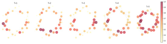 Figure 2 presents the dynamic diffusion of risk in a social network in terms of nodes and edges, with the color intensity reflecting the level of risk (darker colors represent higher risks). Over time (from to ), high-risk nodes gradually transmit the risk to other nodes through the network structure. The network density and risk distribution change significantly, helping to understand the social transmission mechanisms of emotions and risks during the pandemic. Through this risk transmission mechanism, we incorporate health risks into the spatial dimension of the study, providing the foundation for analyzing the interaction between spatial structures and economic decisions (such as housing choices and remote work arrangements).