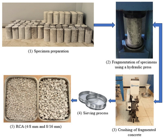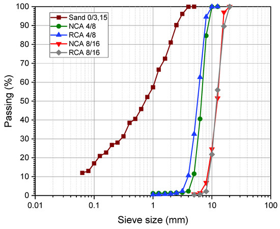 - RCAs with 4–8 mm and 8–16 mm fractions, produced by laboratory crushing of one-year-old concrete samples (Figure 1). These samples were originally formulated using the same constituents and proportions as the reference concrete made exclusively with NCA.