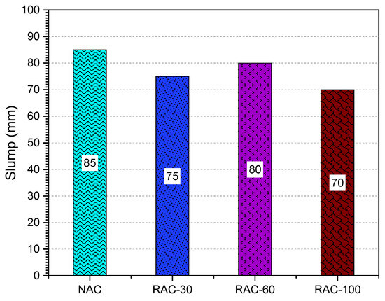 Four concrete mixtures were designed for this study: a control mix using NCA and three RAC mixtures, designated as RAC-30, RAC-60, and RAC-100. In the RAC mixtures, 30%, 60%, and 100% of the NCA, by mass, were replaced with RCA, respectively. All concrete mixtures were designed with a plastic slump (Figure 4). The mix proportions of the concretes are shown in Table 2.