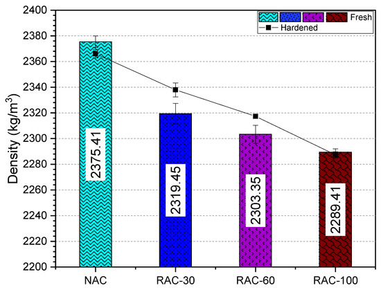 Figure 6 presents the evolution of concrete density in the fresh state and at 28 days. The results indicate that incorporating RCA leads to a progressive density reduction proportional to the substitution rate, with decreases of 3.62% and 3.32% in the fresh and hardened states, respectively, at 100% substitution. This reduction is attributed to the lower density of RCA. These findings align with those reported in refs. [48,54,55,56].