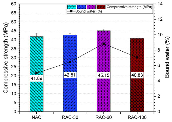 Figure 7 illustrates the evolution of compressive strength and bound water in concrete as a function of the RCA substitution rate. It is observed that the incorporation of RCA positively affects the compressive strength of RAC. A substitution rate of 30% or 100% of RCA results in a compressive strength comparable to that of NAC, while a 60% substitution rate leads to an improvement of 7.75%. Among the three substitution rates analyzed, the 60% rate is found to be optimal, offering the best performance in terms of compressive strength.