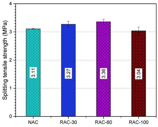 Several studies [19,62,63] show a decrease in splitting tensile strength as the RCA substitution rate increases, with reductions of up to 14% observed in cases of full replacement. In contrast, other research [46,61,64,65] indicates that RAC can achieve splitting tensile strength comparable to, or even exceeding, that of conventional concrete. For instance, Pani et al. [46] found that a 50% substitution rate of RCA optimizes this strength, resulting in a 7% increase compared to the reference concrete. Similarly, Etxeberria et al. [61] observed that full substitution with RCA can enhance splitting tensile strength by 10% compared to conventional concrete.