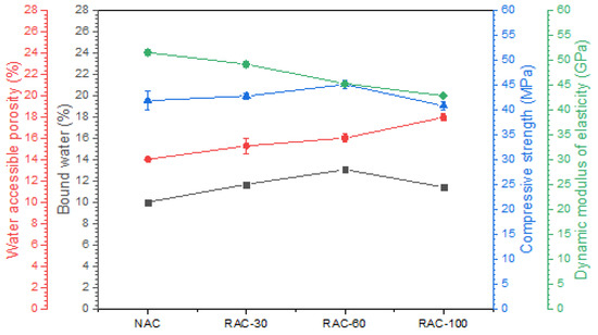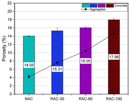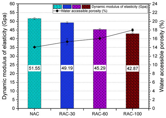 Figure 10 illustrates the correlation between the modulus of elasticity and water-accessible porosity of the concretes. The modulus of elasticity decreases as the RCA substitution rate increases. Compared to NAC, the incorporation of 30%, 60%, and 100% RCA results in reductions of 4.57%, 12.14%, and 16.84% in the modulus of elasticity, respectively. At a 30% substitution rate, the variation in the modulus of elasticity remains negligible; however, beyond this threshold, a significant decrease is observed, primarily due to the substantial amount of residual mortar. This reduction in the modulus of elasticity is directly associated with the increase in porosity, which reaches 8.95%, 14.25%, and 28.01% for substitution rates of 30%, 60%, and 100%, respectively. This rise in porosity is attributed to the inherently high porosity of RCA (Figure 11).
