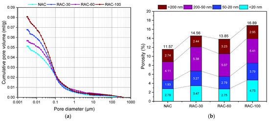 - The discrepancy between the volume of small pores and water-accessible porosity results from pore redistribution and their connectivity. Water-accessible porosity progressively increases with the RCA substitution rate due to the enhanced pore connectivity induced by RCA.